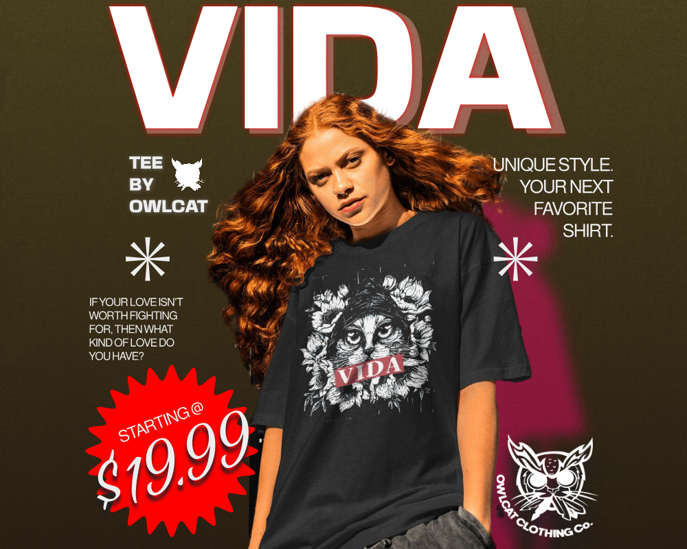 OwlCat going incognito in a bed of flowers in this special design. VIDA means life.
