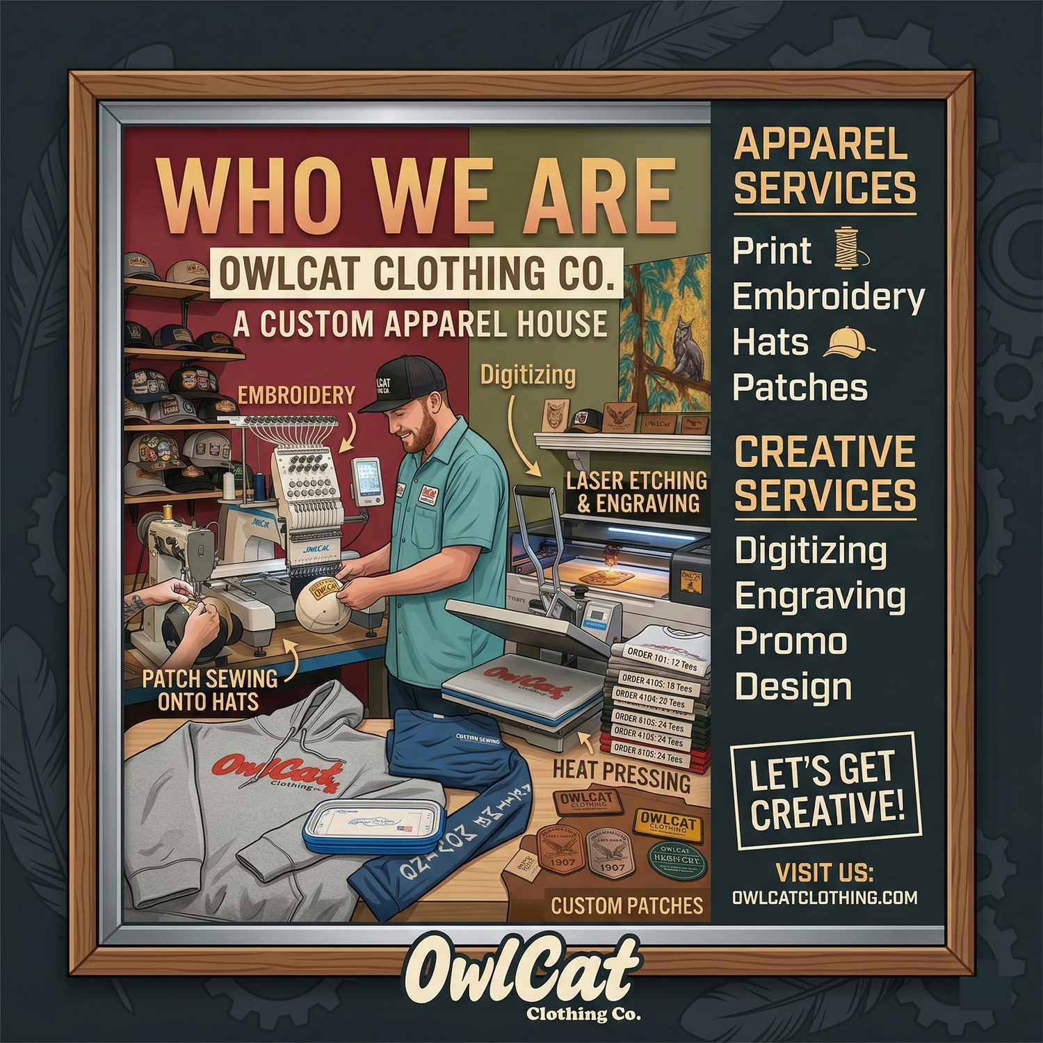 OwlCat Clothing Co. is a premier custom apparel house dedicated to bringing your vision to life.