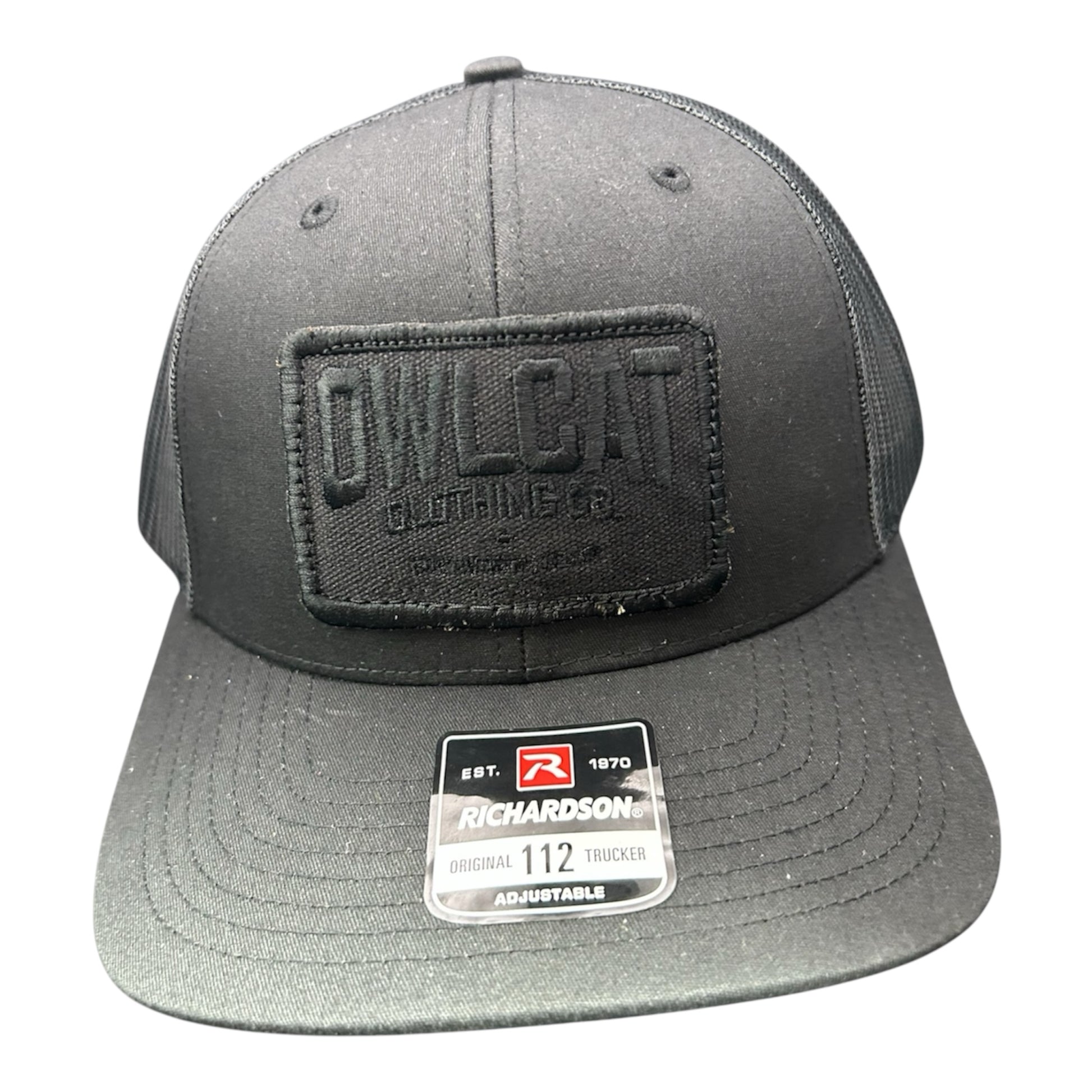 Black on black embroidered canvas patch sewn on an all black Richardson 112